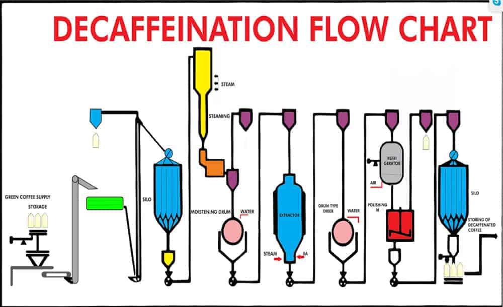 This process works by soaking green coffee in a bath of water and a solvent called ethyl acetate, which is naturally derived from fermented sugar, among other natural sources. The solvent bonds to the salts of chlorogenic acid within the coffee, which allows for the extraction of caffeine. The coffee is removed from its bath and steamed at low pressure to ensure no traces of E.A. are left, and the finished product is almost entirely free of any but the most trivial (0.1–0.3%) caffeine content.