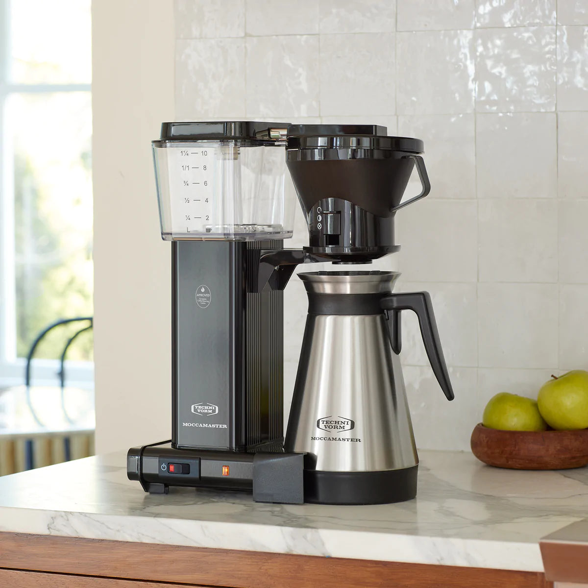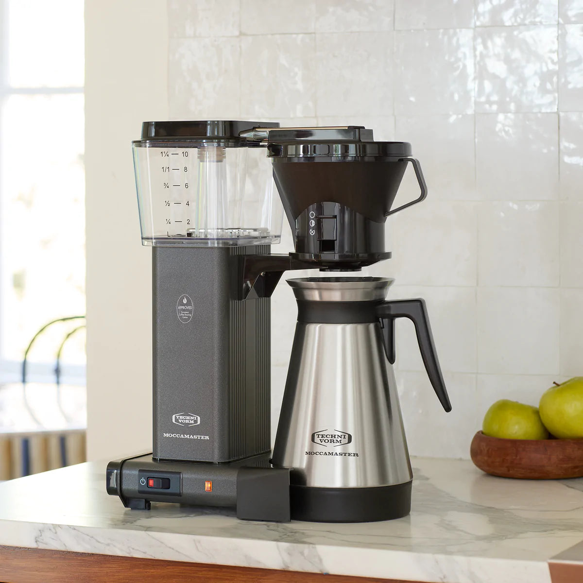 The manual-adjust stop on the KBT’s brew basket allows you to control the brewing speed or stop it entirely as it flows into the carafe. This brewer is a good option for those who like to be more hands-on with their coffee brewing process and don’t consistently brew a full carafe every day. Our double-walled, stainless steel thermal carafe will keep coffee hot for up to an hour – or even longer with the included Travel Lid.