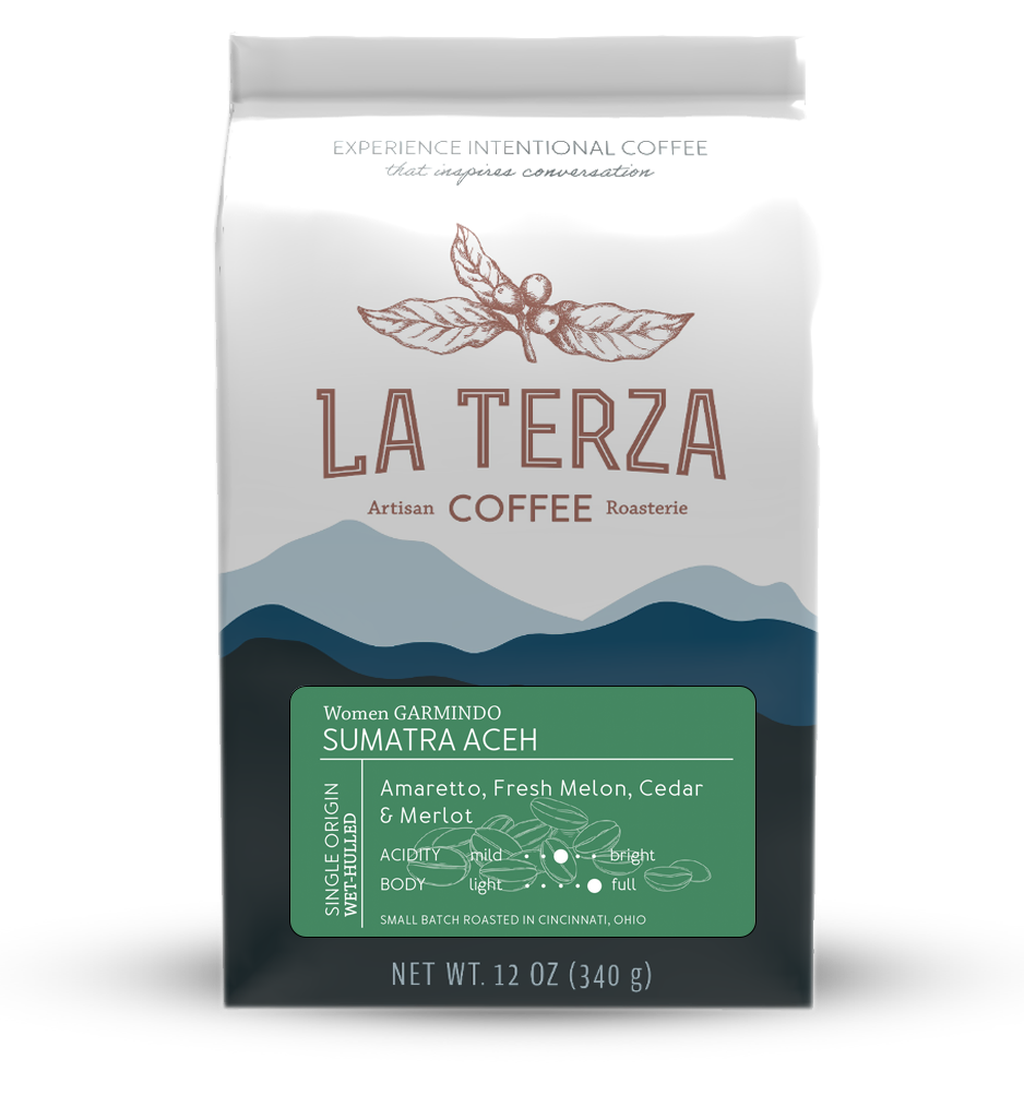 The unique method used in its production results in a very full body with a concentrated flavor, garnished with herbal nuances and a spicy finish. Giling Basah, the name of the traditional Sumatran process, involves hulling the parchment off of the bean at roughly 50% moisture content; for comparison, most other processes hull coffee at around 10-12% moisture. This unique Sumatran process results in a trademark flavor profile (low acidity and a richness that lingers on the back of the palate) and gives the green beans a signature dark color. Notes of chocolate are evident in the finish.